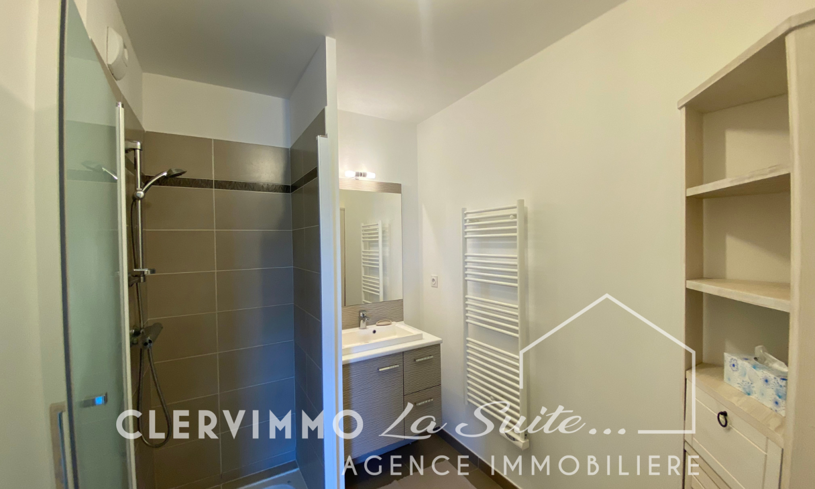 Salle d'eau avec douche italienne et meuble vasque. WC indépendant.