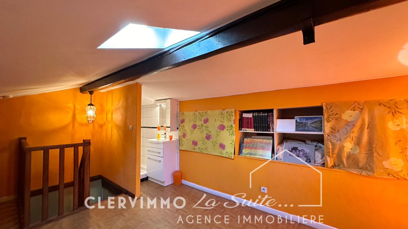 À l'étage, une chambre mansardée avec VELUX, une douche et un lavabo.